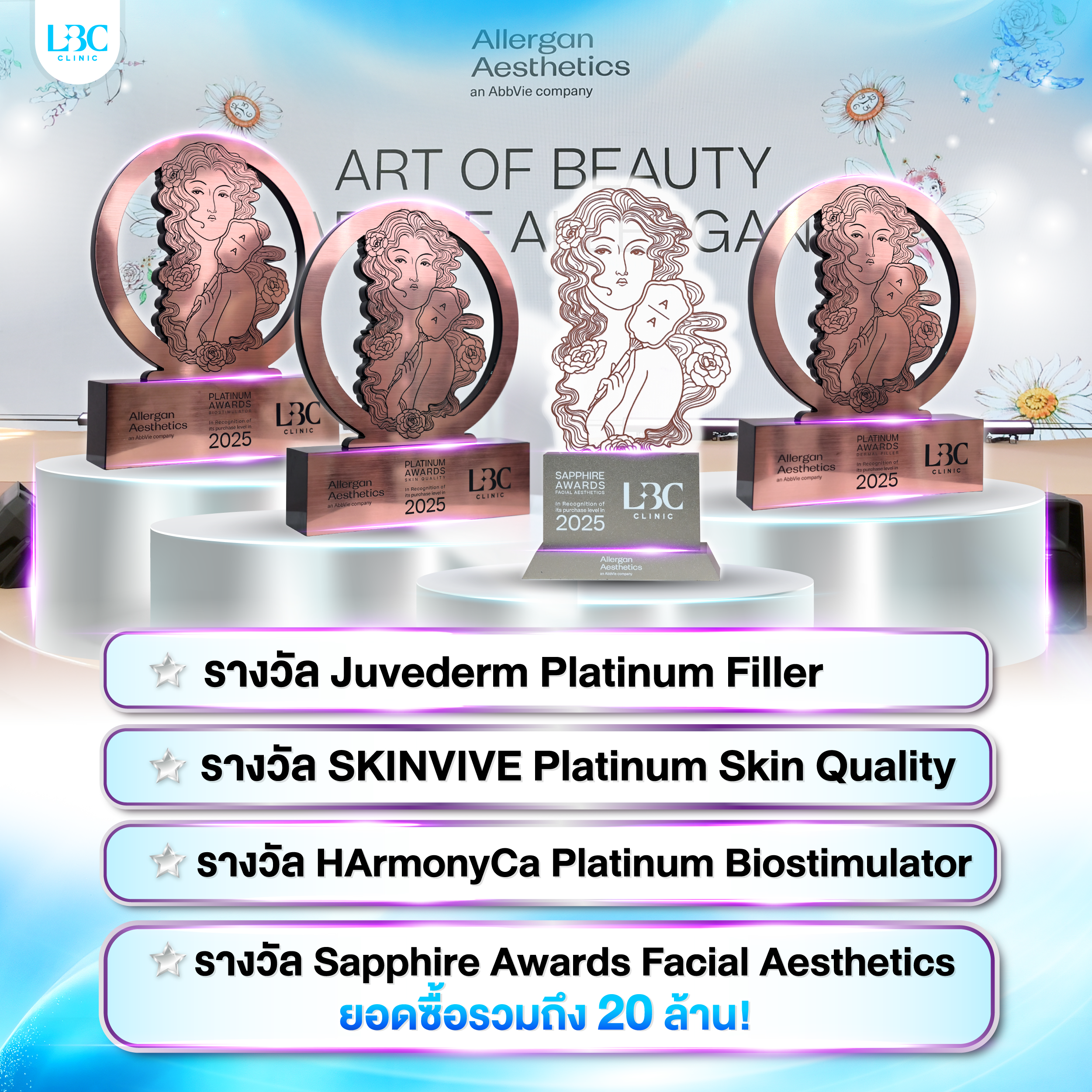 ความสำเร็จจาก รางวัล Allergan 2025 ทั้ง 4 รางวัลระดับ Platinum คือเครื่องยืนยันถึงมาตรฐานการดูแลความงามของ LBC CLINIC ทั้งในด้านทีมแพทย์ เทคโนโลยี และผลลัพธ์ที่พิสูจน์ได้จริง