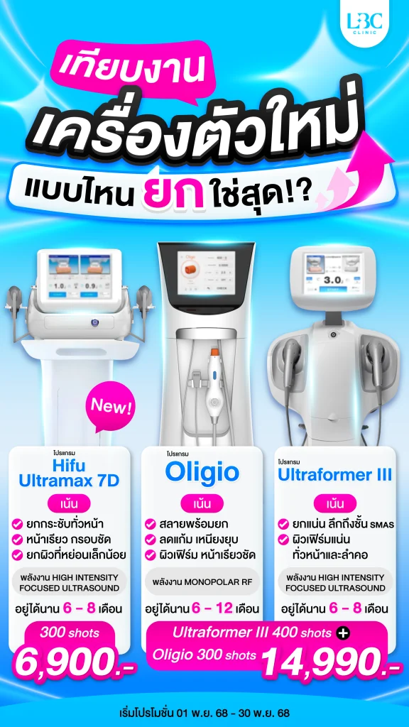 โดยที่ LBC Clinic เรามี 3 โปรแกรมยกกระชับตัวท็อปที่ให้ผลลัพธ์แตกต่างกัน เพื่อให้เหมาะกับปัญหาผิวของแต่ละคน ได้แก่ โปรแกรม HIFU Ultramax 7D, โปรแกรม ULTRAFORMER III, และโปรแกรม Oligio