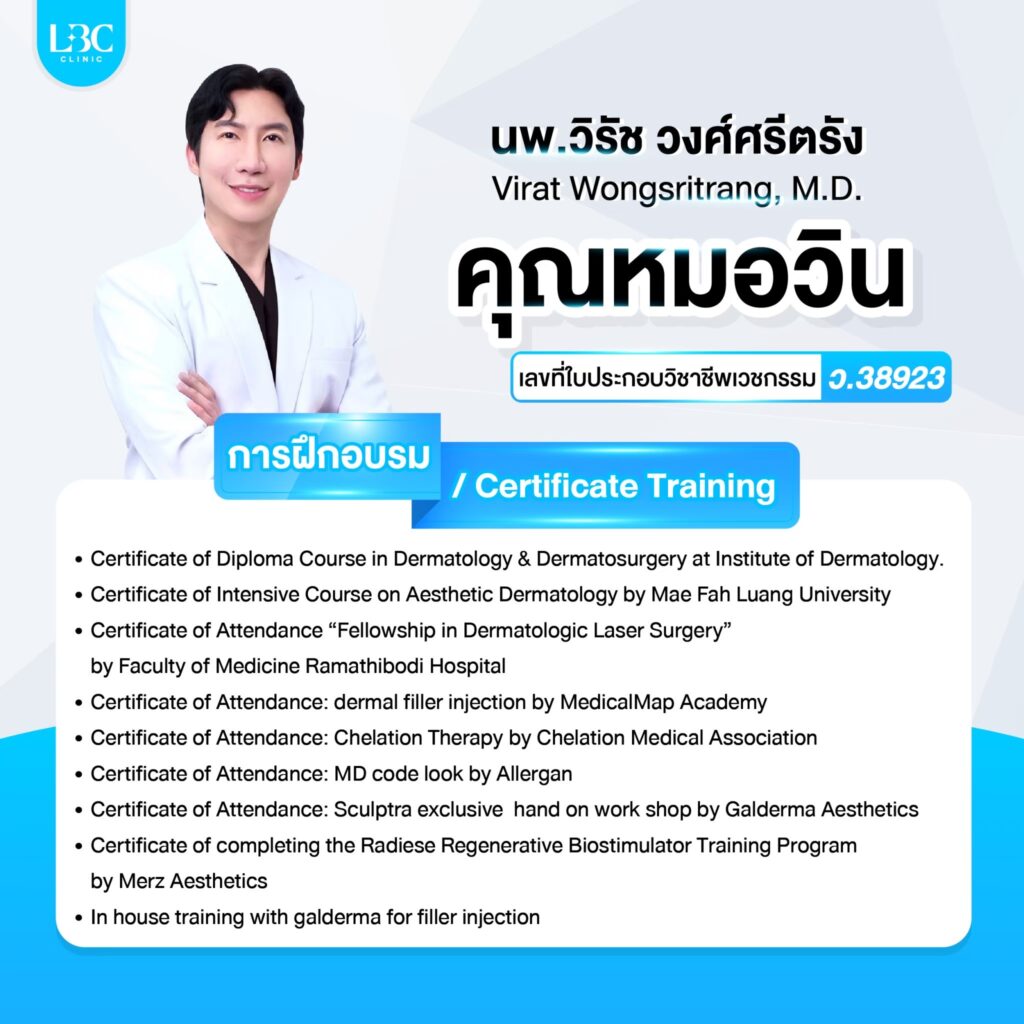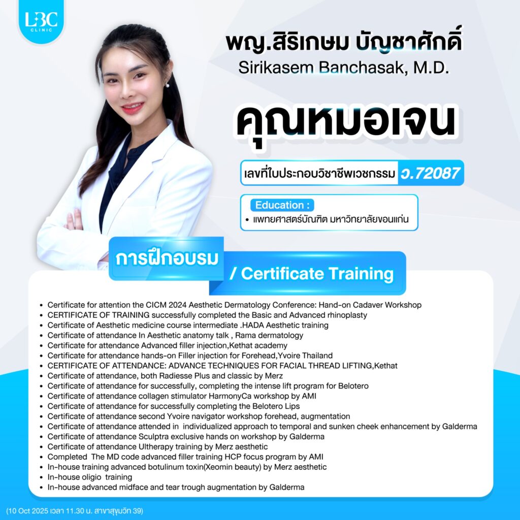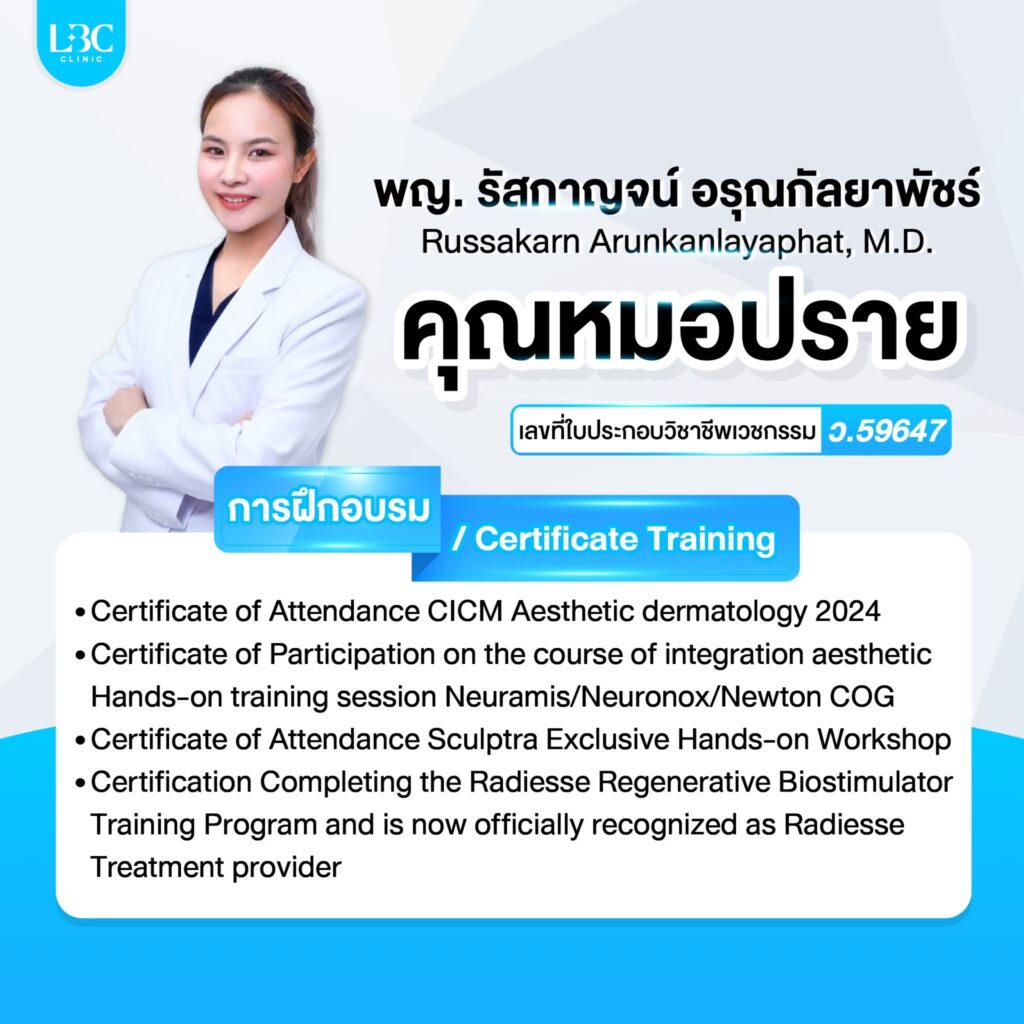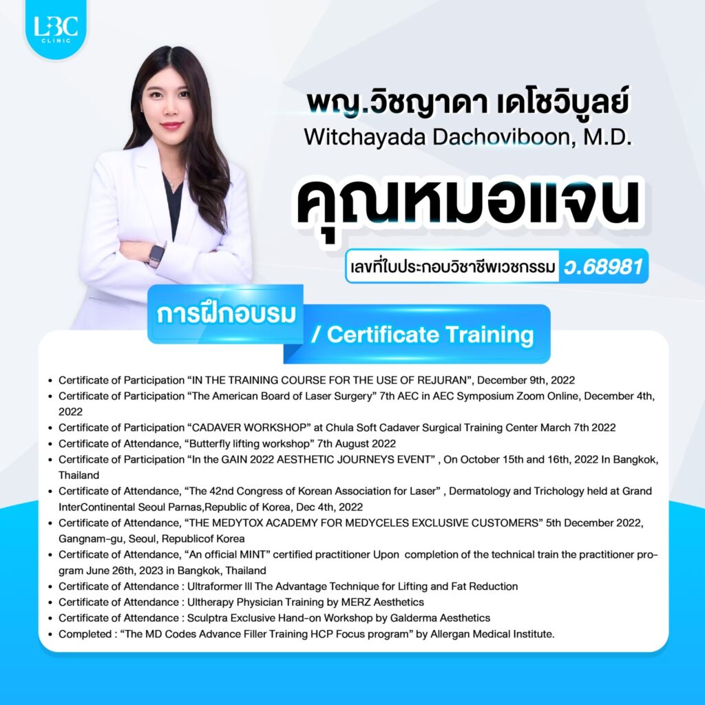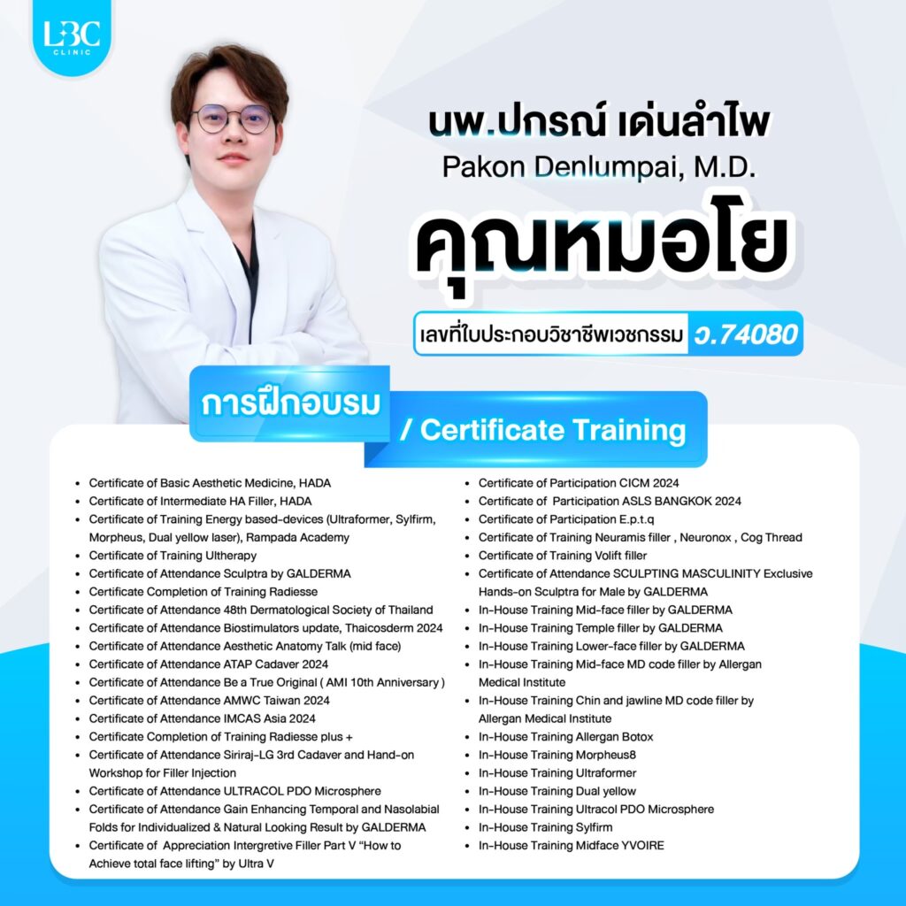 ทีมแพทย์ผู้เชี่ยวชาญของ LBC CLINIC ทุกคน ได้เข้ารับหลักสูตรอบรม และฝึกฝนความชำนาญอยู่เสมอ พร้อมกับอัพเดทความรู้เพิ่มเติมอยู่ตลอดเป็นประจำทุกปี ทำให้เทคนิคการฉีดต่างๆ ไม่ว่าจะเป็นฟิลเลอร์ โบทอกซ์ แฟต หน้าใส หรือการทำยกกระชับใบหน้า ร้อยไหม จึงมั่นใจได้ว่า ผู้ที่เข้ารับบริการที่ LBC CLINIC จะได้รับบริการที่ปลอดภัยจากแพทย์ผู้เชี่ยวชาญ และได้ผลลัพธ์ที่แม่นยำ ดูเป็นธรรมชาติ