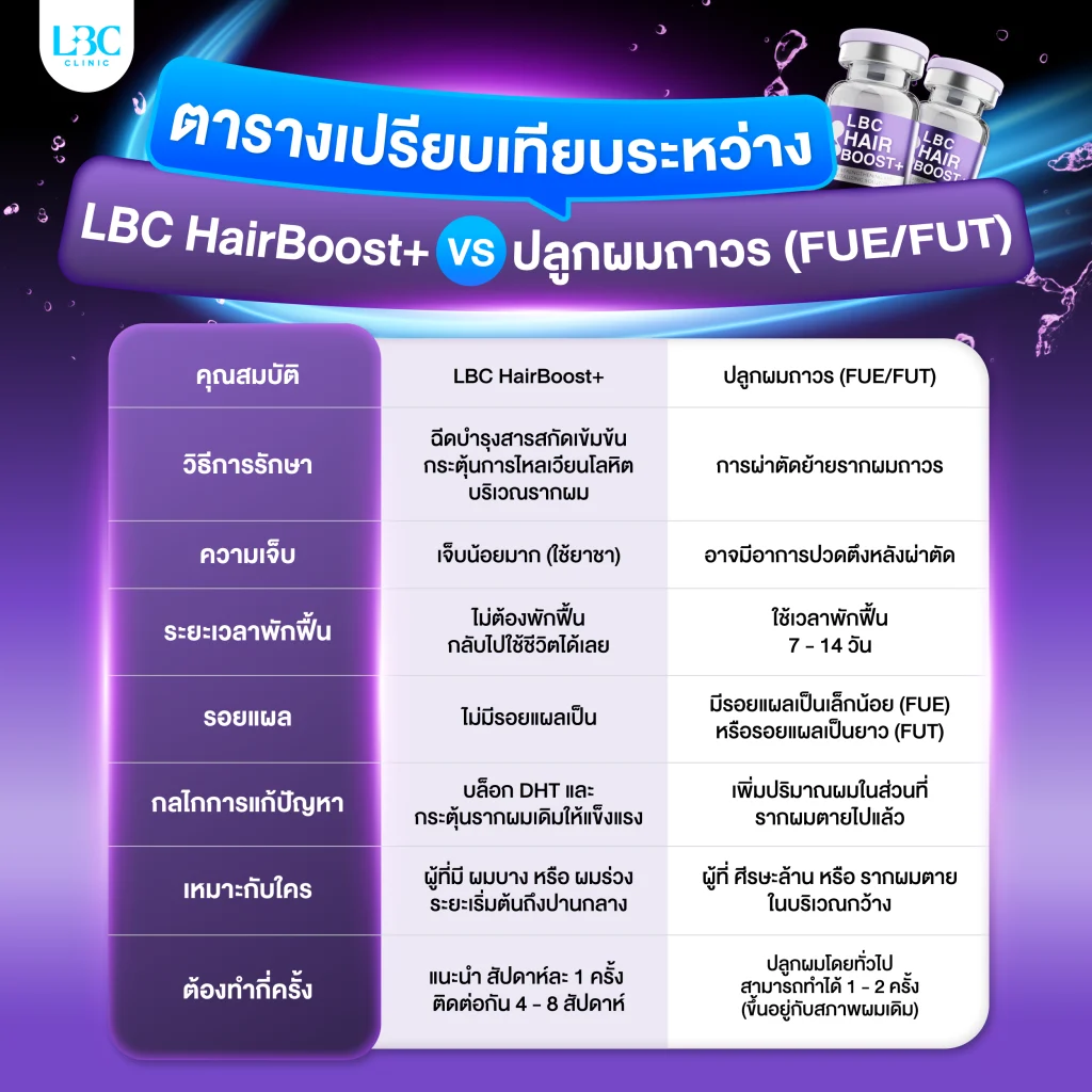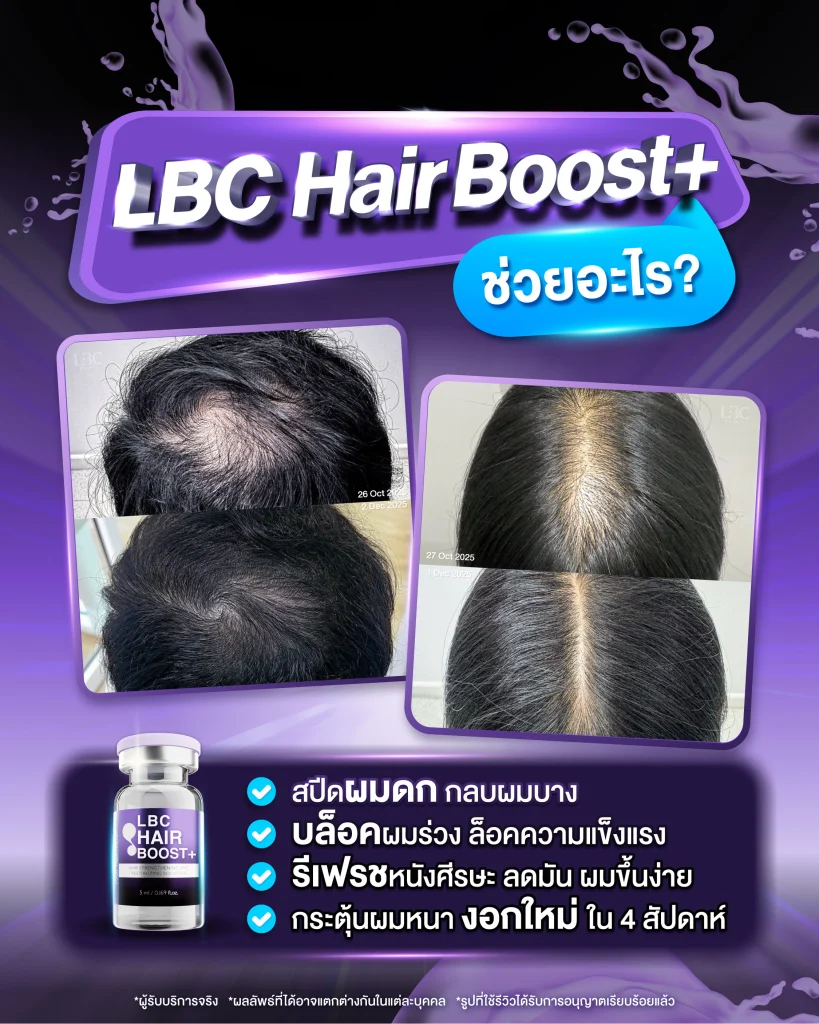 - ความแตกต่าง: การปลูกผมถาวรเหมาะสำหรับผู้ที่ รากผมตายไปแล้ว ในบริเวณกว้าง แต่ โปรแกรม LBC HairBoost+ เหมาะสำหรับผู้ที่ ผมบาง หรือ ผมร่วง ในระยะเริ่มต้น ที่รากผมยังสามารถฟื้นฟูและกระตุ้นการงอกใหม่ได้ ซึ่งเป็นการรักษาที่ทันท่วงทีและคุ้มค่ากว่า