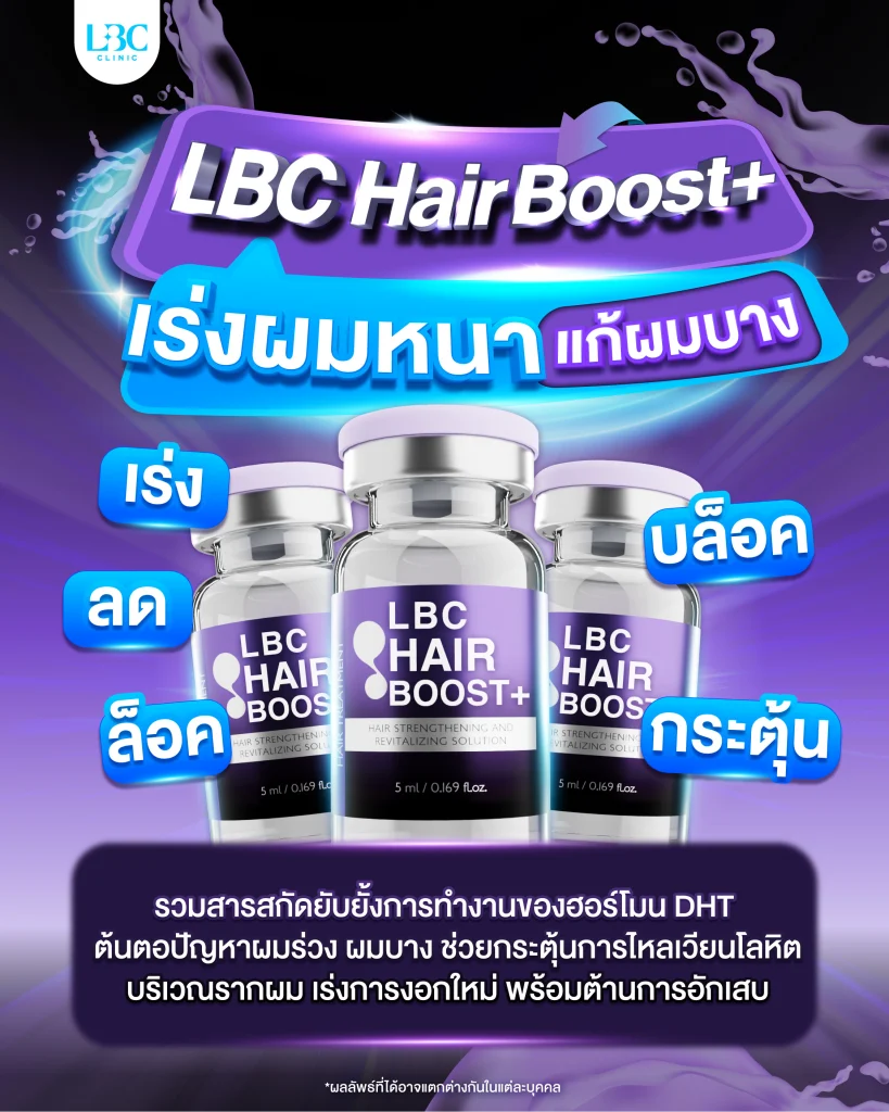 ขอแนะนำ โปรแกรม LBC HairBoost+ คือ “Meso Hair” นวัตกรรมเข้มข้นที่ออกแบบมาเพื่อ แก้ผมบาง และ ลดผมร่วง ที่ต้นเหตุ โดยมีจุดเด่นคือ ไม่ต้องผ่าตัด และ ไม่ต้องพักฟื้น โปรแกรม LBC HairBoost+ จะช่วยฟื้นฟูรากผมที่อ่อนแอ ลดปัญหาผมร่วงจากความเครียด ฮอร์โมน หรือแม้แต่ ผมบางกรรมพันธุ์ ในระยะเริ่มต้น