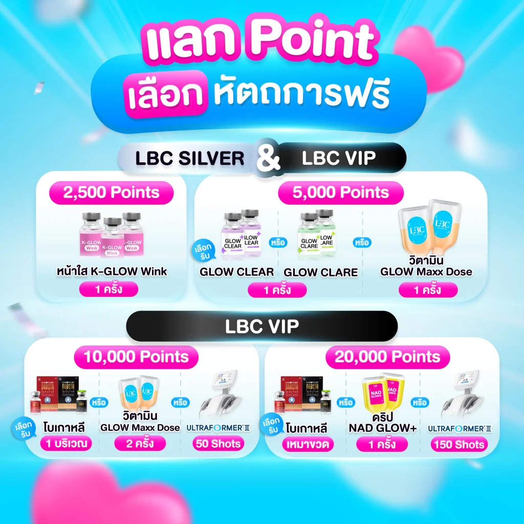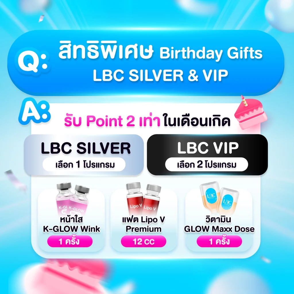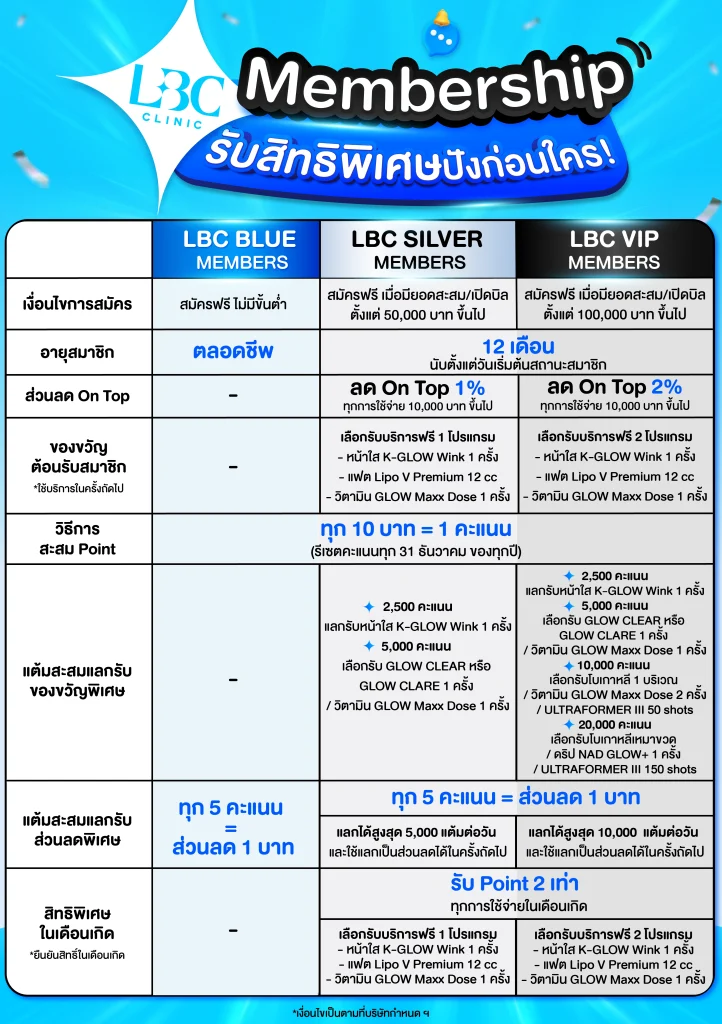 LBC Membership ไม่ใช่แค่ระบบสมาชิกธรรมดา แต่คือสิทธิพิเศษที่ LBC CLINIC อยากมอบให้ลูกค้าคนสำคัญทุกคน ตั้งแต่ส่วนลด ของขวัญวันเกิด ไปจนถึง Points สะสมแลกหัตถการฟรี ทั้งหมดนี้ สามารถรับได้ ฟรี แค่สมัครสมาชิกเท่านั้น