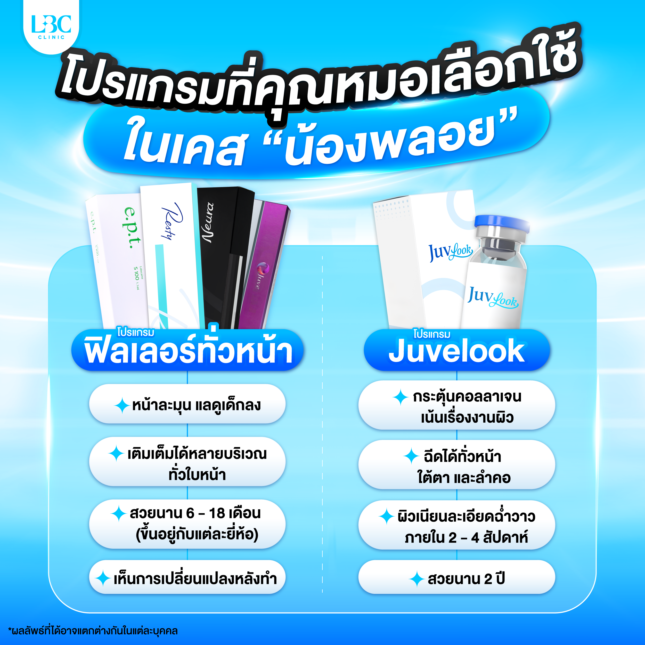 • โปรแกรมฟิลเลอร์ สวยนาน 6 – 18 เดือน (ขึ้นอยู่กับแต่ละยี่ห้อ)