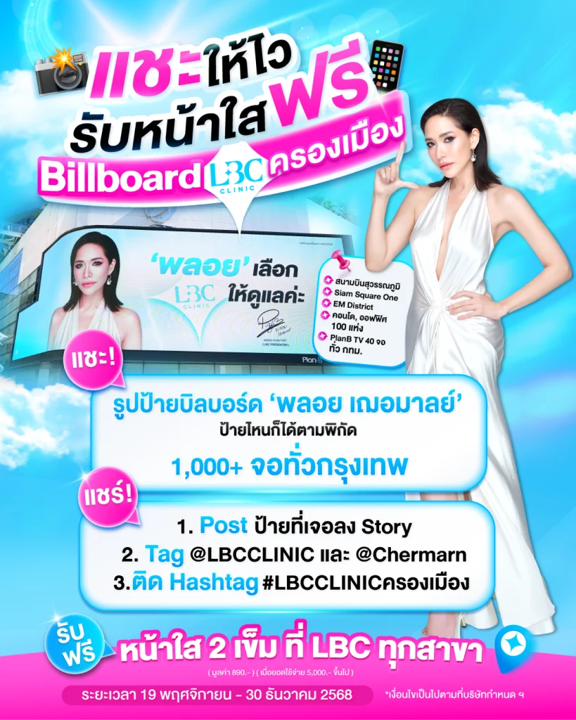 แคมเปญ LBC ครองเมือง จัดขึ้นมาเพื่อให้ทุก ๆ คนรู้จักและจดจำภาพลักษณ์ LBC CLINIC ให้ชัดเจนได้มากยิ่งขึ้น ด้วยการกระจายสื่อไปยังหลากหลายพื้นที่สำคัญทั่วกรุงเทพ ทำให้ภาพของ LBC CLINIC พร้อมการเปิดตัวพรีเซนเตอร์ “พลอย เฌอมาลย์” ปรากฏอย่างต่อเนื่องและเป็นธรรมชาติ ช่วยเสริมการรับรู้แบรนด์อย่างนุ่มนวล แต่ทรงพลัง และเข้าถึงกลุ่มคนเมืองได้อย่างกว้างขวางยิ่งขึ้น