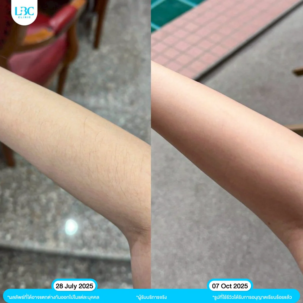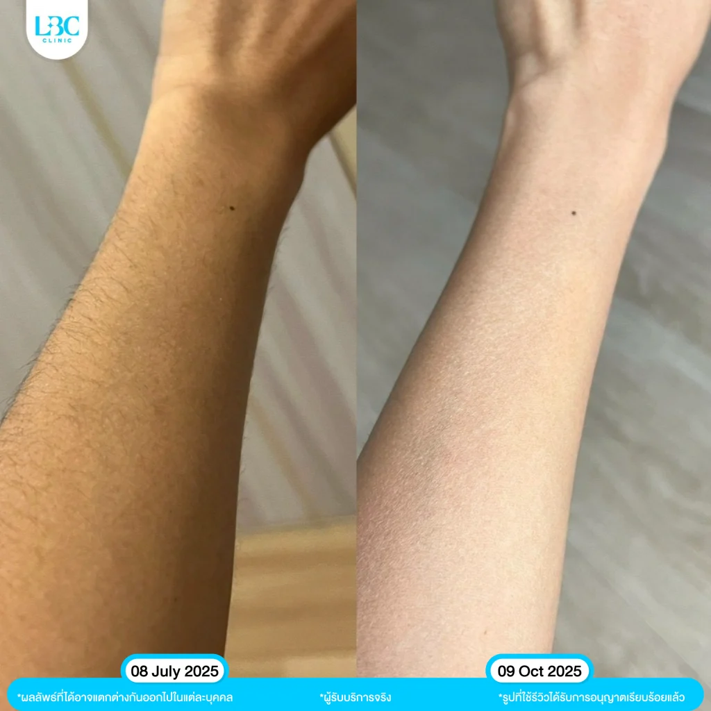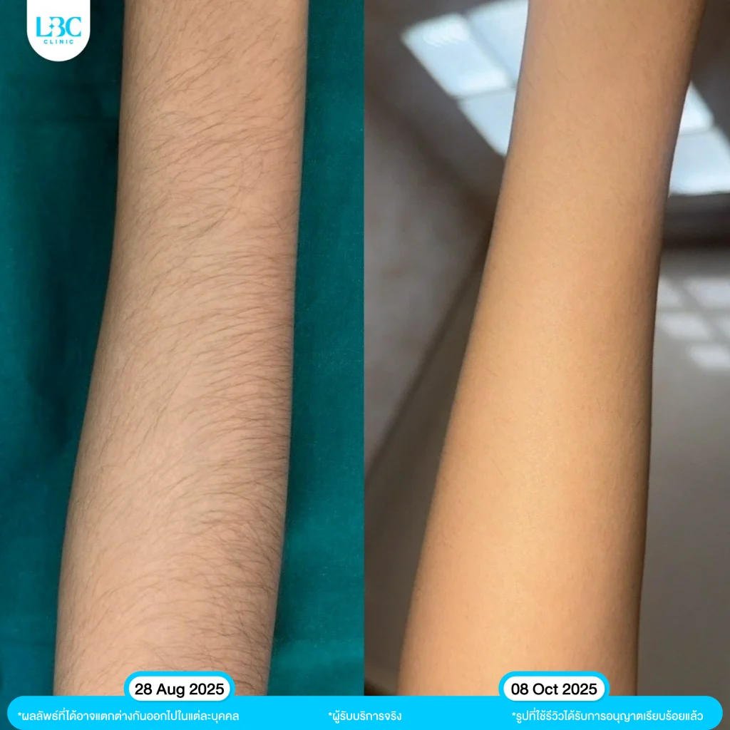 จะเห็นผลลัพธ์เต็มที่ จะสังเกตเห็นได้ชัดว่าขนลดลงอย่างต่อเนื่อง ผิวดูนุ่ม ละเอียด และสว่างขึ้น - ระยะติดตามผล 6 เดือน ถึง 1 ปี