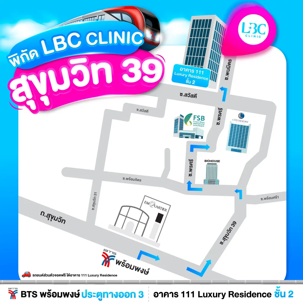 แอล บี ซี คลินิก สาขาสุขุมวิท เลขที่ 111 อาคารเรสซิเดนซ์ ชั้น 2 ห้องเลขที่ 201 ซอยสุขุมวิท 39 (พร้อมพงษ์) แขวงคลองตันเหนือ เขตวัฒนา กรุงเทพมหานคร 10110